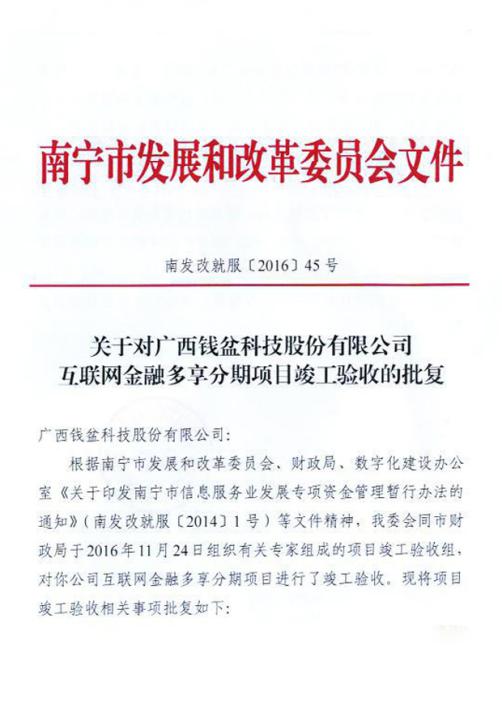 据悉,2016年12月31日,钱盆网多享分期项目通过了广西南宁市发展和改革委员会的专项资金审批,获得近百万元的资金支持。且在此次的获批企业中,包括高新科技、精英突出企业共18家,而钱盆网是唯一一家互联网金融平台。