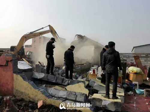 面对如此强大的拆违阵式,第三处违建户早已开始自拆工作了,雇了人工、车辆,来来回回穿梭,自己动手清运物资。鉴于当事人积极配合拆违的态度,指挥组给予其搬运时间,拆违队伍也借此机会进行休整和午餐。下午2点破拆组一声令下,伴随着一阵机械轰鸣声,先前耸立的一座1000平方米砖混办公楼和4000平方米钢构厂房,旋即成为一片废墟。