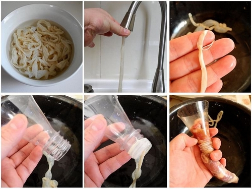 第四步:灌肉肠衣用前吹口气,检查下有没有破的地方。然后用漏斗将肉慢慢送到肠衣里,尽量塞得满些、肥瘦均匀。肠衣破了的地方可以打结。