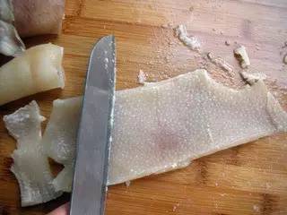第二步:猪皮去油捞出猪皮,用刀刮去猪皮表面的肥油,去猪毛。将猪皮切条,加一勺盐和小苏打,反复搓洗,进一步去油。