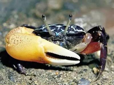 招潮蟹会做出舞动大螯的动作,这个“招潮”的动作,目的是用大螯威吓敌人,或是求偶。此外,招潮蟹还有一对火柴棒般突出的眼睛,非常特别。