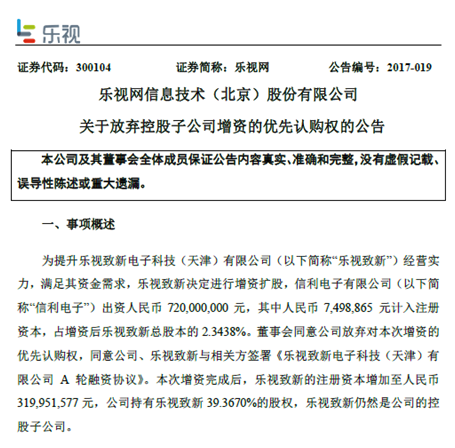 董事会同意公司放弃对本次增资的优先认购权,同意公司、乐视致新与相关方签署《乐视致新电子科技(天津)有限公司A轮融资协议》。本次增资完成后,乐视致新的注册资本增加至人民币319,951,577元,乐视网持有乐视致新39.3670%的股权,乐视致新仍然是其控股子公司。