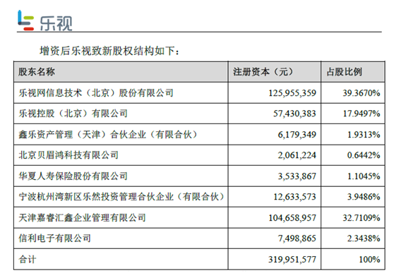 公告显示,为提升乐视致新经营实力,满足其资金需求,乐视致新决定进行增资扩股,信利电子出资人民币720,000,000元,其中人民币7,498,865 元计入注册资本,占增资后乐视致新总股本的2.3438%。。