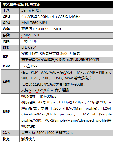 作为小米公司的首款智能手机芯片,澎湃S1定位中高端市场, 采用高能效八核ARM Cortex-A53处理器。big.LITTLE架构设计保证性能与功耗的完美平衡:大核为主频2.2GHz四核ARM Cortex-A53,小核为1.4GHz四核ARM Cortex-A53,在GeekBench多核测试中,领先高通主流中端的骁龙625。GPU采用Mali-T860 MP4,旨在以更低的能耗提供绝佳的性能。相比Mali上一代,Mali-T860性能提高了1.8倍,相同性能下功耗降低40%,并对包括Vulkan在内的接口全面支持。