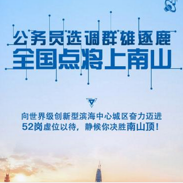 深圳市南山区面向全国公开选调公务员,职位多达52个。这也是南山区首次大规模的选调,职位覆盖区委(区政府)办、团区委、发改局、住建局、教育局、审计局、统计局、财政局、街道办事处等。符合条件的公务员均可报考,报名时间截至2017年3月14日。