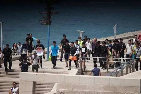 ▲ 黄渤、孙红雷等“极限6天王”在青岛奥帆中心情人坝拍戏。