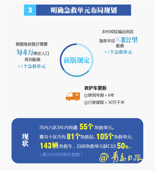 为解决救护车辆不足的问题,《规定》要求,按照每4万常住人口规划配备不低于1辆救护车,农村或者较偏远地区急救半径不超过8公里配备不低于1辆救护车。此外,为解决急救资源布局不均衡、急救服务半径过长、交通拥堵等导致出现“无车可派”的情况,市急救中心及各区市急救中心利用科技手段实现了调度指挥标准化、规范化。