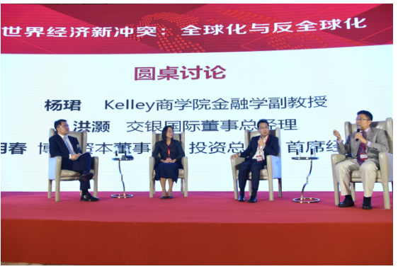 随后的圆桌论坛环节,Kelley 商学院金融学副教授杨珺女士,交银国际董事总经理洪灏先生,博海资本有限公司(香港)董事长、投资总监、首席经济学家孙明春先生围绕“地缘政治与全球化的冲突”为主题进行了热烈讨论,将会场氛围推向高潮。