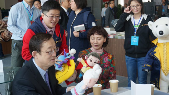 (图有青岛出版集团孟鸣飞董事长,国家新闻出版广电总局出版管理司司长于慈珂,山东省政协副主席郭爱玲,山东省新闻出版广电局局长司安民,副局长谢宁,山东省新闻出版广电局副局长钟华与玩偶大师产品)