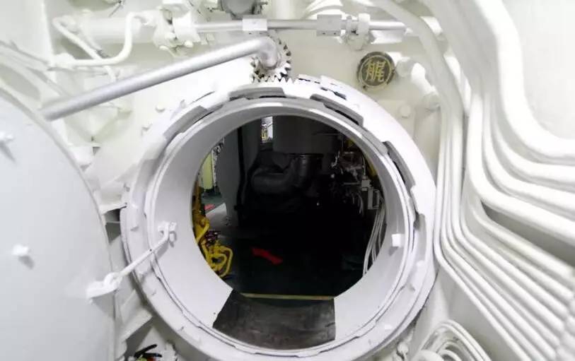 △在每个舱门两侧都有一个圆形的小牌,分别写着“艏”和“艉”,这些字都是荧光字,能在在黑暗中发光,是为战士们识别方向设计。