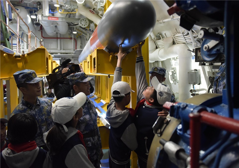 △参观的人群中还有一个特殊的群体,他们来自祖国的四面八方,是“北海舰队”微信公众号推选出的“军粉”。图为参观人员穿过水密门。