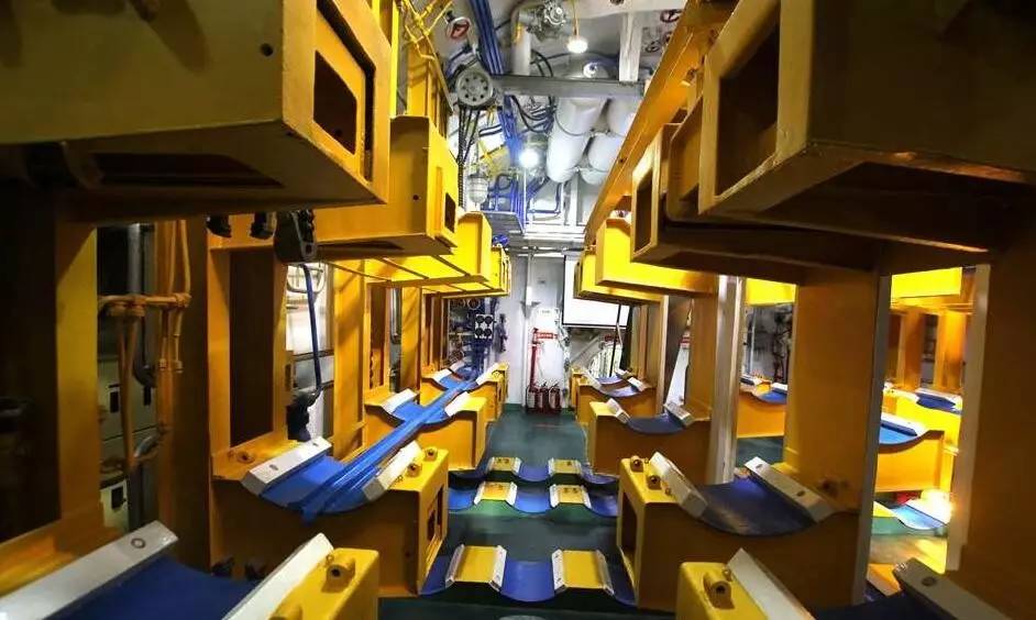 △楼梯两侧是放置鱼雷的架子,即鱼雷托架。