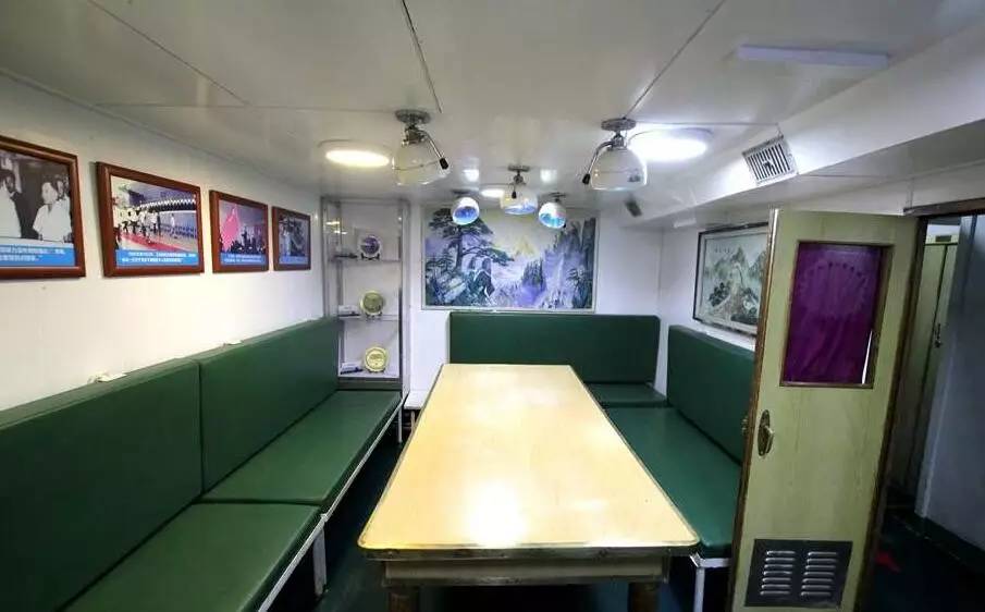 △鱼雷舱的一侧是一个小会议室,也是手术室。会议室的桌子和绿皮凳子以及墙上挂的两幅画都是“原装”的。两幅画,一幅是迎客松图,一幅是长城图。