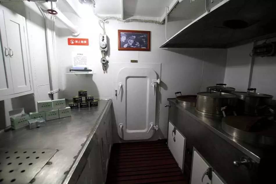 △厨房很小,一侧是案台,一侧是蒸煮区域。厨房里挂着潜艇官兵吃饭的“历史照片”。