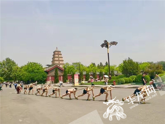 华龙网4月26日15时讯(记者 刘雪琴)今(26)日上午,重庆武隆的“山城棒棒军”惊现西安回民街、钟楼、城墙、大雁塔等西安地标性地点,多位《印象武隆》原生态演员身着纤夫服装,手持棒棒、口喊川江号子,进行了一场别开生面的精彩路演,吸引了众多西安市民的眼球。