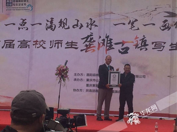 吉尼斯世界纪录有限公司大中华区认证官Johngagrlang(葛蓝)颁发证书 见习记者 梁小龙 摄