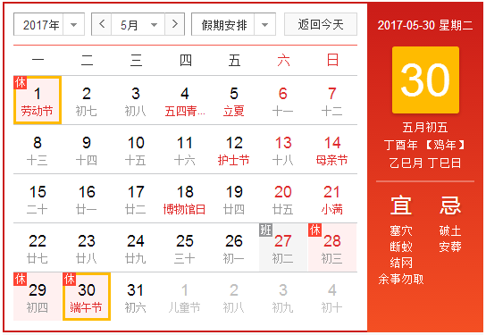 2017年端午节是5月30日,农历五月初五,星期二。根据《国务院办公厅关于2017年部分节假日安排的通知》,2017年端午节放假安排如下: