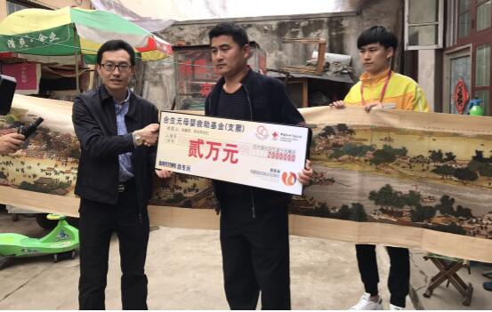 中国红十字会--合生元母婴救助基金山东大区志愿服务负责人高洪涛将爱心款交到张善领手中。