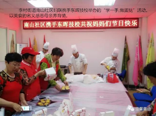 李村街道南山社区妇联携手东晖技校举办的“学一手,做蛋挞”以美食的名义感恩母亲养育情。
