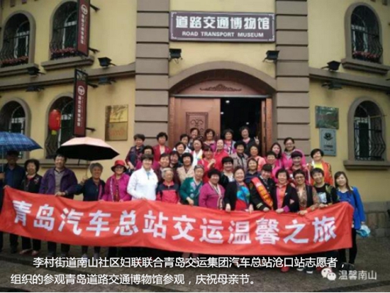 李村街道南山社区妇联联合青岛交运集团汽车总站沧口站志愿者,组织的参观青岛道路交通博物馆参观,庆祝母亲节。