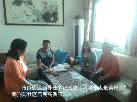 沧口街道领导任书记走访“岛城十大最美母亲”紫荆苑社区居民高香玉和“岛城最美母亲”振北社区居民杨红琴。