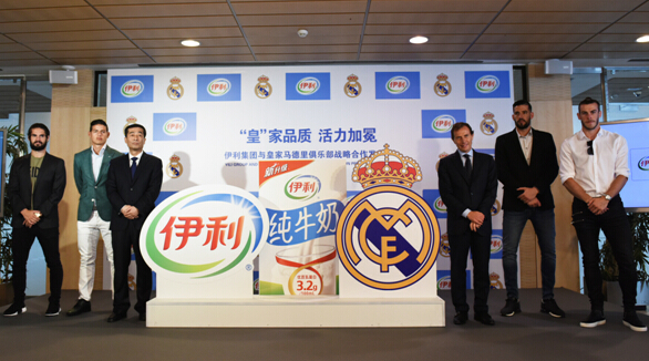 伊利集团执行总裁张剑秋与皇马公关部长布特拉格诺及四位现役球员共同揭秘伊利牛奶产品