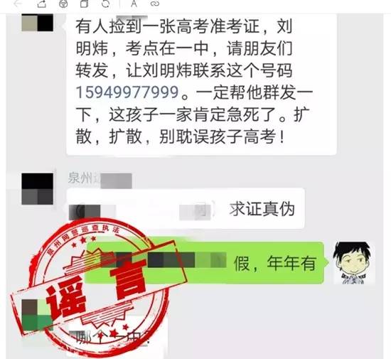 真相:同一信息多地散布,联系电话多为虚假。其实早在2012年,就有“XXX的准考证掉了”的谣言,年年考试,年年传谣,骗子们,快放手吧!