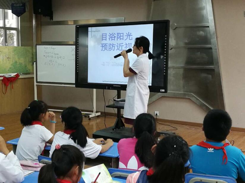 图为北京师范大学附属学校目浴阳光爱眼讲座,山东省眼科验光配镜中心高级验光师孔玲正在进行演讲