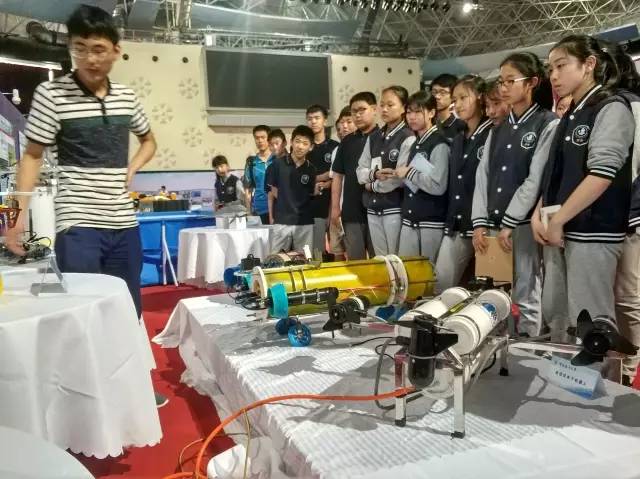 UFO式海洋航行器、海洋流场可视仪、避障无碳小车、标语打印机、潮流能发电装置、3D打印、激光雕刻、体能训练营……这些新颖实用的发明创造让学生们大大过了一把动手操作的瘾,还有海豚仿生机器人、水下管道探测机器人、管道内壁污垢清除机器人等功能强大的“机器人家族”,让同学们深刻体会到人类的无穷智慧和现代科技所带给人们的便捷。在参观体验的过程中,孩子们也不时用纸笔做着记录,让接收到的新鲜知识更加牢固地印刻自己的脑海里。