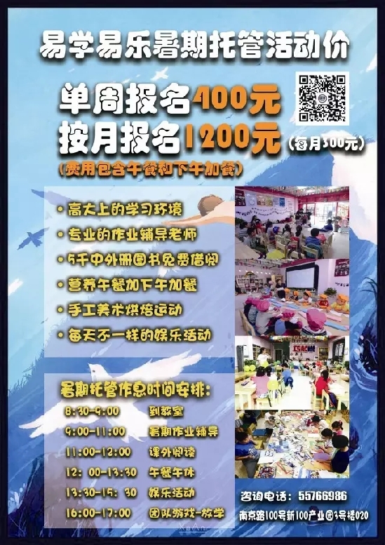 现在扫码关注,在平台留言:暑期托管+宝贝名字+联系电话,就可免费体验易学易乐暑期课堂1整天。