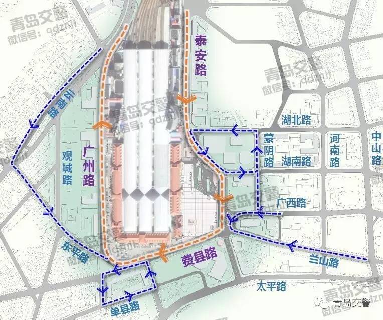 目前,接送客主要通行线路为:泰安路(北向南)→费县路(东向西)→广州路(南向北)。