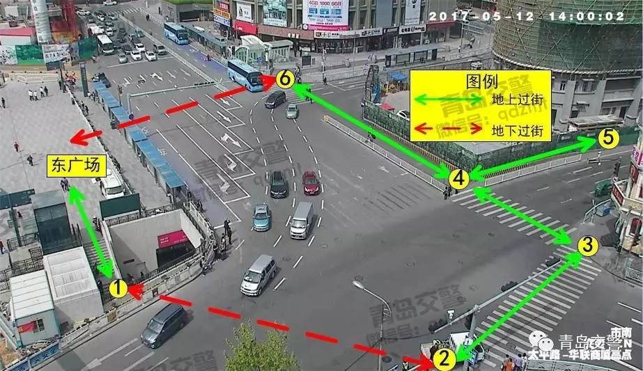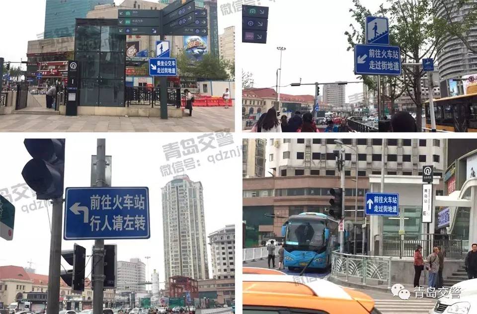 为规范通行秩序,消除安全隐患,交警支队完善了青岛火车站周边的行人通行导向标识系统,请行人按交通标志牌指示通行。
