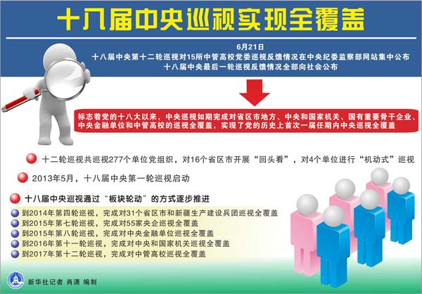 这标志着党的十八大以来,中央巡视如期完成对省区市地方、中央和国家机关、国有重要骨干企业、中央金融单位和中管高校等5个“板块”的巡视全覆盖,实现了党的历史上首次一届任期内中央巡视全覆盖。