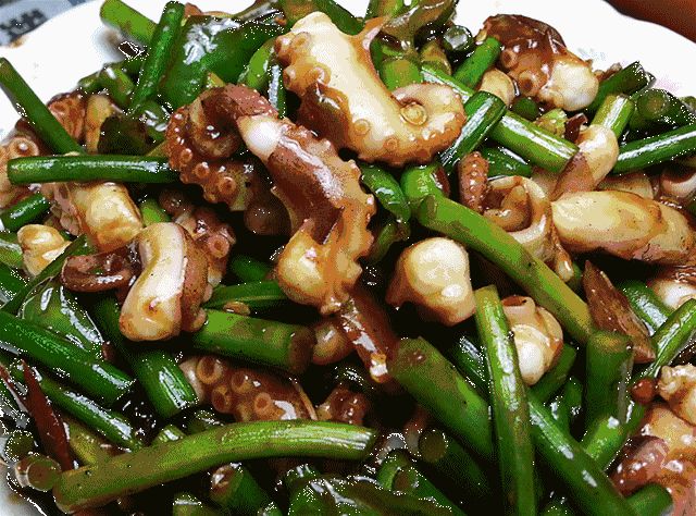 3、锅中放油,下入蒜薹、姜、葱、蒜煸香,倒入八带鱼,翻炒片刻;