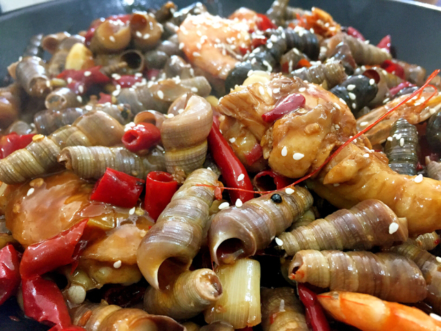 海瓜子是青岛不少海鲜大排档的一道特色菜,学名叫纵肋织纹螺,夏季是旺产期,可以辣炒、姜汁、酱爆,很入味儿。