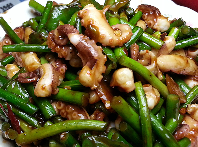 食材:八带、蒜薹、盐、老抽、白糖、姜、蒜、葱、料酒
