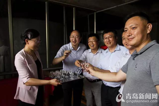 晚上7时,全体成员齐聚沂山秦池蓝莓酒庄,参加由临朐县工商联、青岛川华实业有限公司、山东秦池集团举办的“蓝莓之约”青岛市临朐商会联谊晚宴。晚宴开始前,与会嘉宾参观游览了蓝莓园区、东镇酒窖和酒文化展厅。