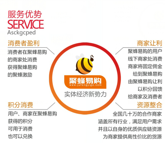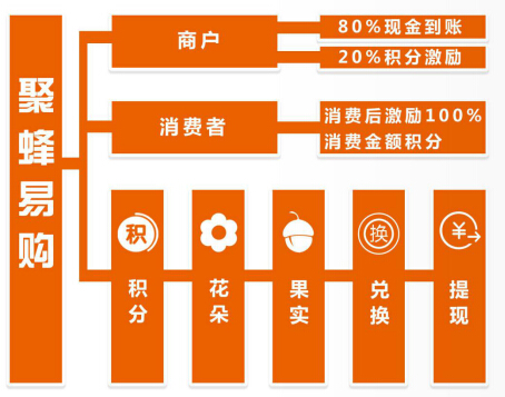 聚蜂易购就是激励商城模式的典型代表。商家入驻聚蜂易购,每笔销售额以固定比率佣金给聚蜂易购。聚蜂易购对商家、消费者进行积分激励。每一笔消费都可以得到消费额的积分激励,积分可以用来兑换成花朵,花朵得到果实,果实可以用来回购,让消费者摆脱传统平台只花钱不挣钱的“魔咒”。消费者越买越划算,商家越卖越盈利,购买力不断提高,消费实现持续循环。