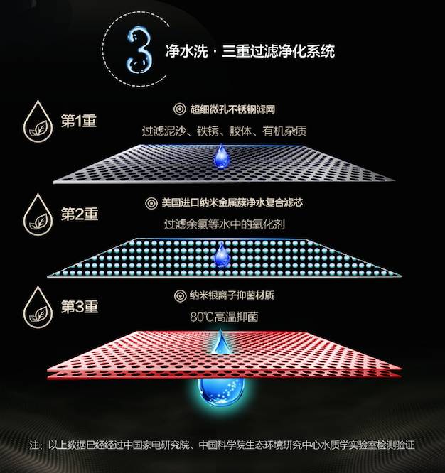 其次,海尔A9净水洗技术的三重净化系统,分别通过超细微孔不锈钢滤网,过滤直径大于0.1mm的泥沙、铁锈、胶体和有机杂质等;通过美国进口纳米金属簇净水复合滤芯,去除90%以上的余氯;以及通过纳米银离子抑菌材质实现80℃高温抑菌,抑菌率高达99.9%。(数据来源:中国家电研究院、中国科学院生态环境研究中心水质学实验室、中国科学院微生物研究报告检验鉴定报告(2015)微检字第337号)