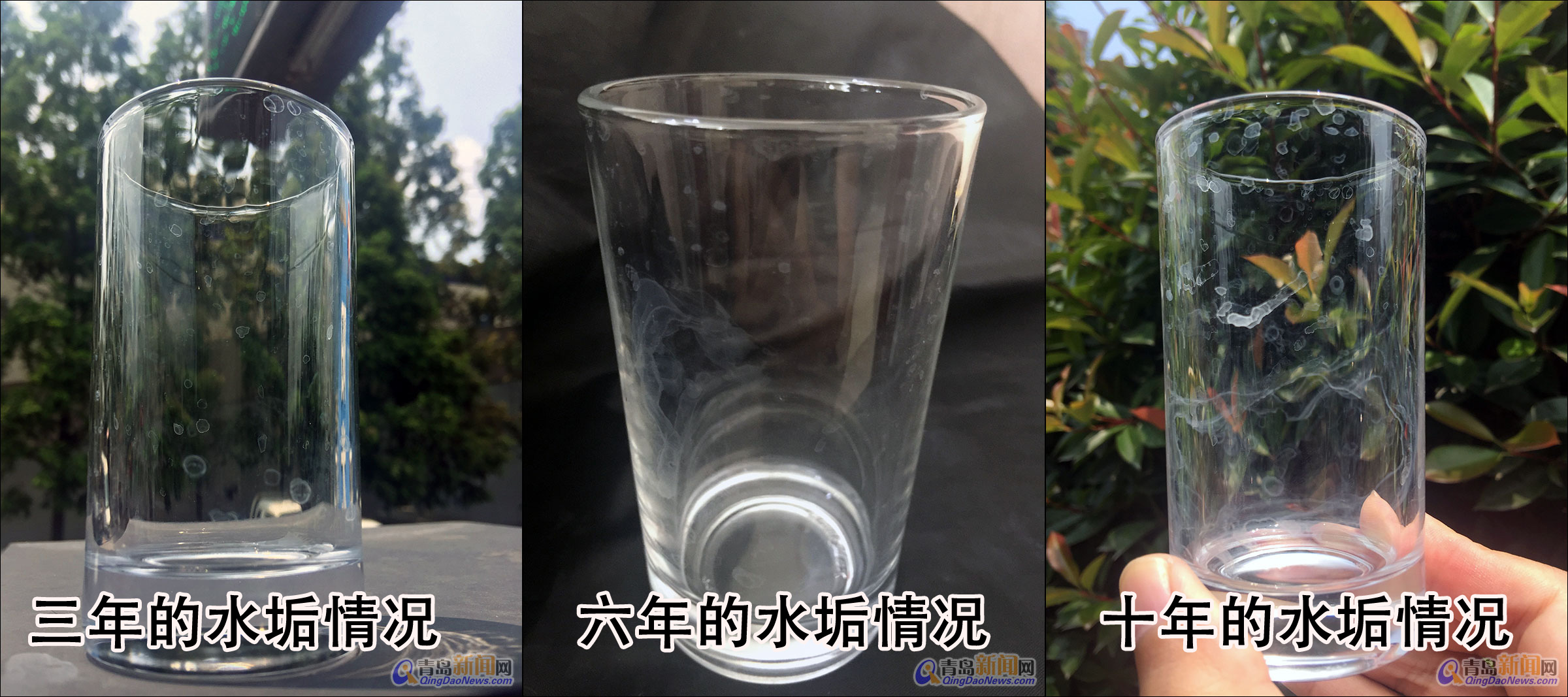 下图就是,使用透明玻璃杯接过使用三年、六年、十年以上的电热水器热水,经干燥后出现的水垢附着情况。