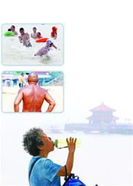 昨天白天,记者在市区沿海一线看到,很多人在海水中寻找清凉,各海水浴场都挤满了游客,虽然实际气温最高34.1℃,但在户外的体感温度更高,特别是马路上有地面反射的热量,实际感受到的温度可能超过40℃。游客们也都用了各种方式防暑降温,湿毛巾、太阳伞、太阳镜、丝巾等装备几乎全部到位,连在海水中游泳也不忘戴上遮阳帽或墨镜。有空调的餐厅、商店等也成为市民和游客避暑的好去处。