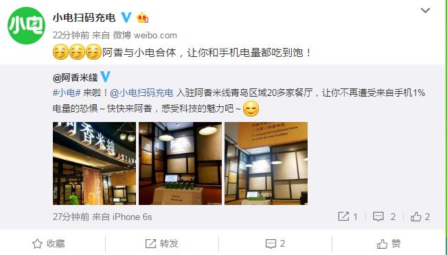 与此同时,小电科技也与阿香米线在微博上大秀恩爱。阿香米线官方微博表达了对小电科技提供共享充电服务的感谢:“小电扫码充电入驻阿香米线青岛区域20多家餐厅,让你不再遭受来自手机1%电量的恐惧!”。小电官微也随即回应:“阿香与小电合体,让你和手机电量都吃到饱!”