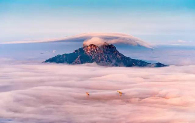 (浮山与平流雾,浮山上方的云雾有如从“火山”中喷发而出;摄影师@徐堃)