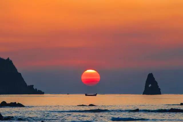 (夕阳下的渔船,画面右侧为著名的石老人,为17米高的石柱,中间部分石块崩落,形成了一处空洞;摄影师@烟雨斜阳)
