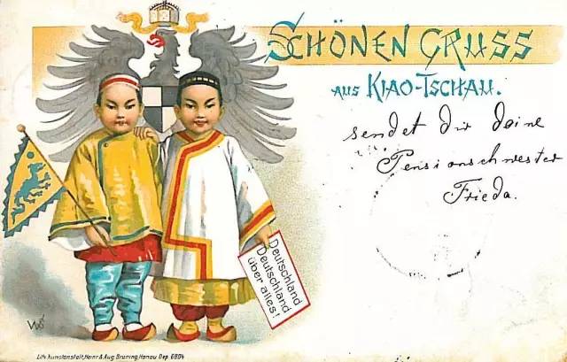 (1898年的明信片《来自胶澳的问候》,有些讽刺的是画风结合了中国儿童的形象,作者未知;图片源自@维基百科)