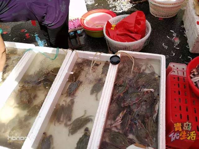 这里的螃蟹几乎都是打氧的,而且品种也超级多。就是路面比较窄、比较滑,大家在买海鲜的时候一定要记得看好脚下的路。