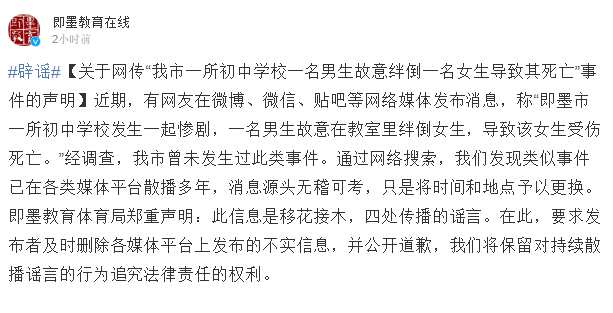 青岛新闻网9月7日讯 近日,记者从即墨市教育体育局官方微博得到消息,近期,有网友在微博、微信、贴吧等网络媒体发布消息,称“即墨市一所初中学校发生一起惨剧,一名男生故意在教室里绊倒女生,导致该女生受伤死亡。”经调查,我市曾未发生过此类事件。通过网络搜索,我们发现类似事件已在各类媒体平台散播多年,消息源头无稽可考,只是将时间和地点予以更换。即墨教育体育局郑重声明:此信息是移花接木,四处传播的谣言。在此,要求发布者及时删除各媒体平台上发布的不实信息,并公开道歉,即墨教育体育局将保留对持续散播谣言的行为追究法律责任的权利。