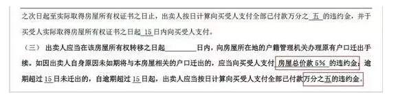 在合同里也要明确逾期户口迁出的违约金问题,一般的中介合同中,都会在“权属转移登记”中作出详细约定: