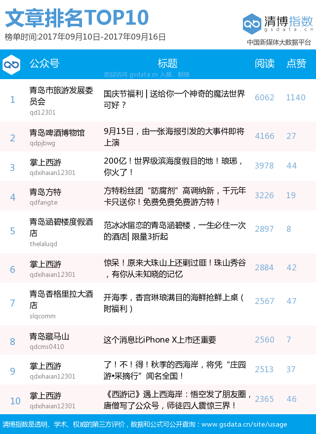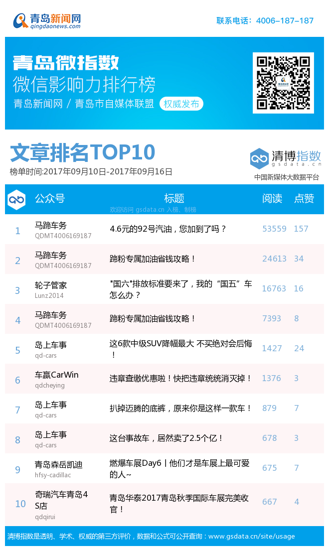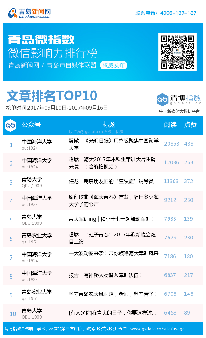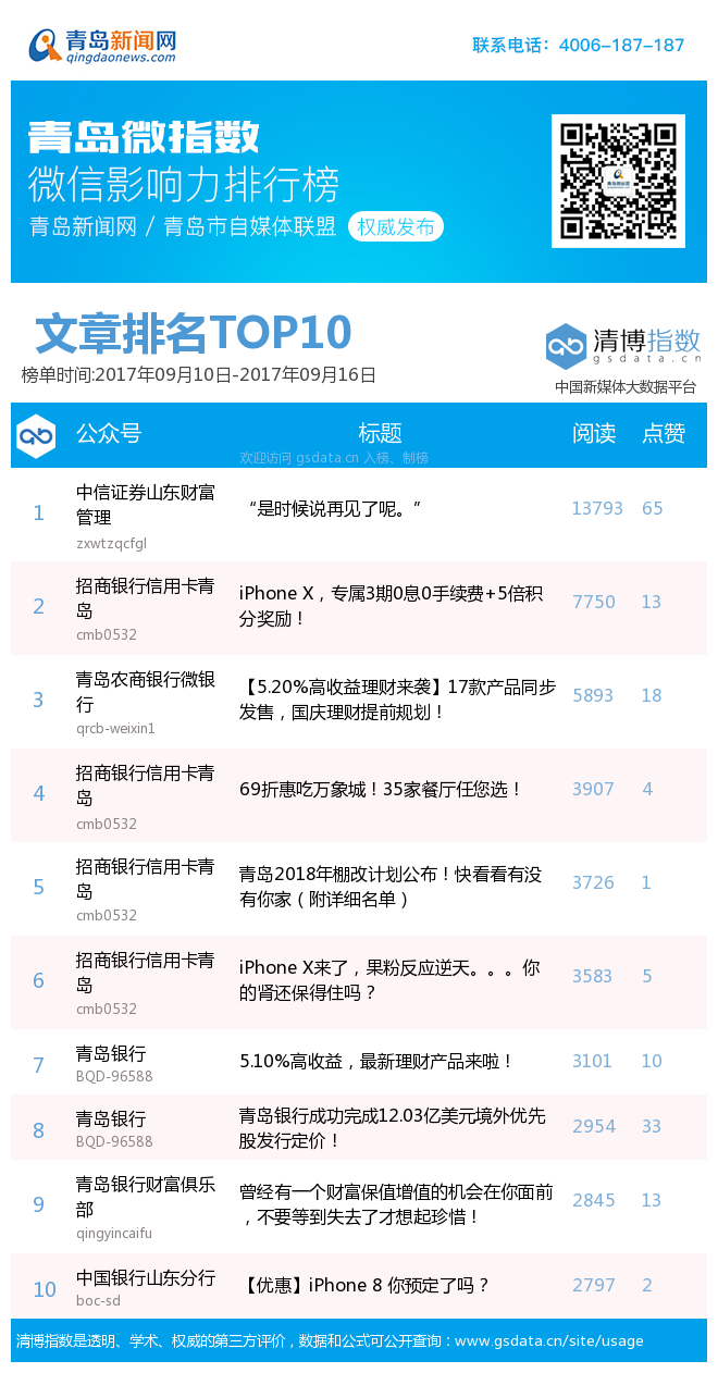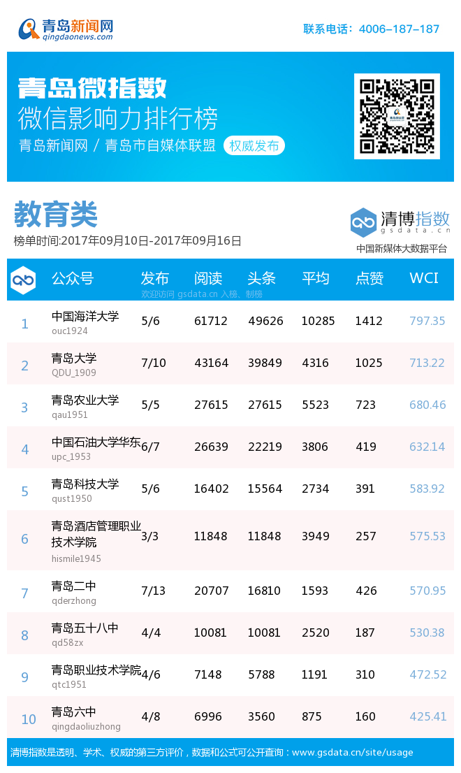 3、本次榜单收录了青岛13个行业微信公众号,如您的账号暂未收录,可联系4006-187-187。