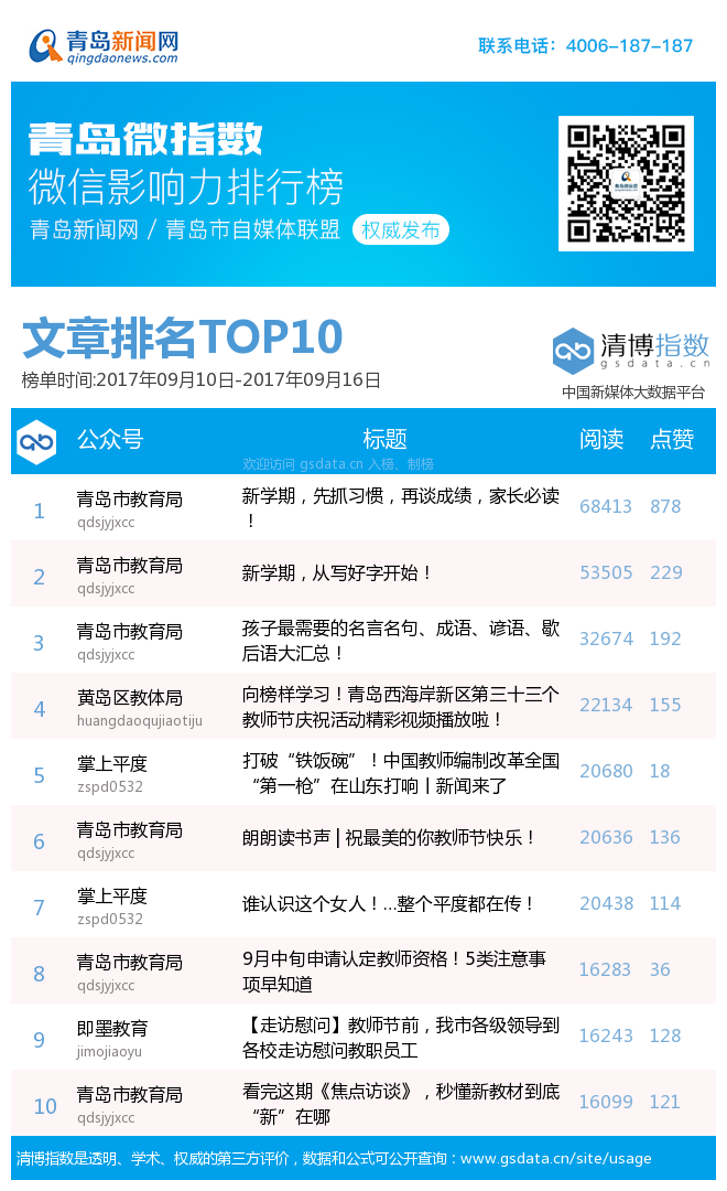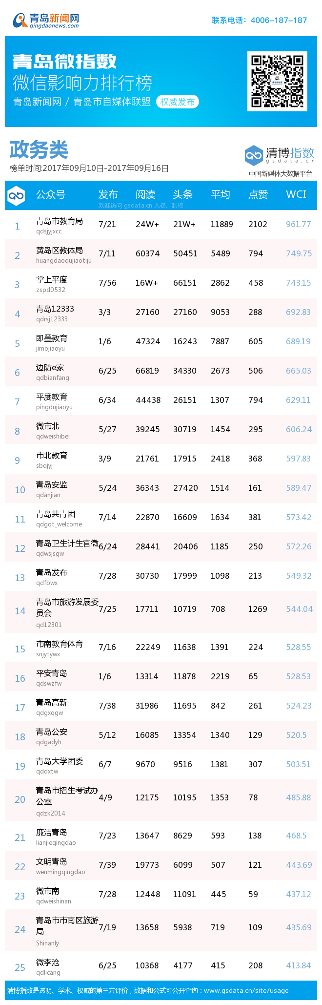 从WCI指数来看,本周政务类微信指数整体有所下降,过600的只有8个,比上周少3个。但值得注意的是,“青岛市教育局”在整体指数走低的情况下,仍以总阅读数24W+,总点赞数2102,WCI指数961.77的好成绩高居政务类榜首,成为本周政务类唯一一个指数上涨50+的微信,其发布的文章在热文榜TOP10中更是霸占7篇。
